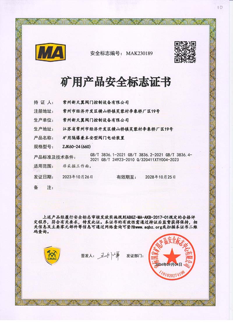 礦用隔爆ZB10-24中國國家強制性產品認證證書110.2